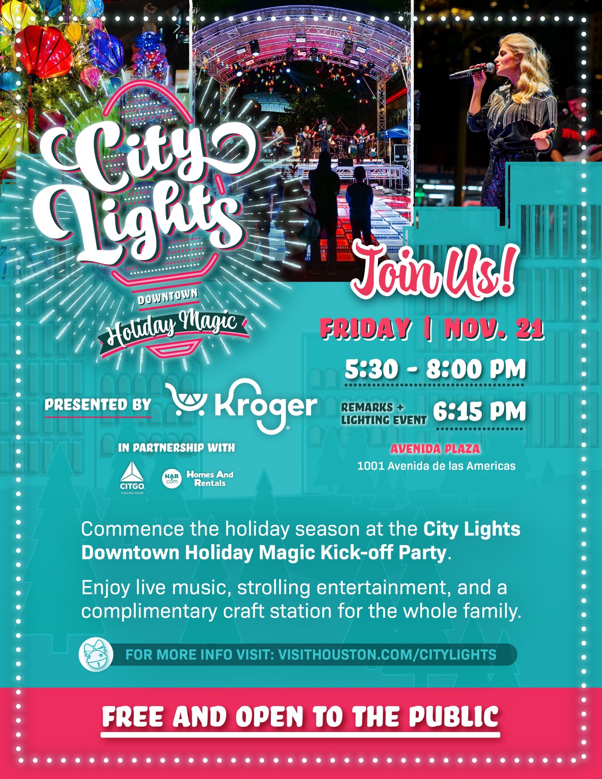 Downtown is about to shine again. City Lights—presented by Kroger with support from CITGO and the Houston Association of Realtors—is officially kicking off the holiday season on Friday, November 21, 2025, at 5:30 p.m. on The Plaza at Avenida Houston.